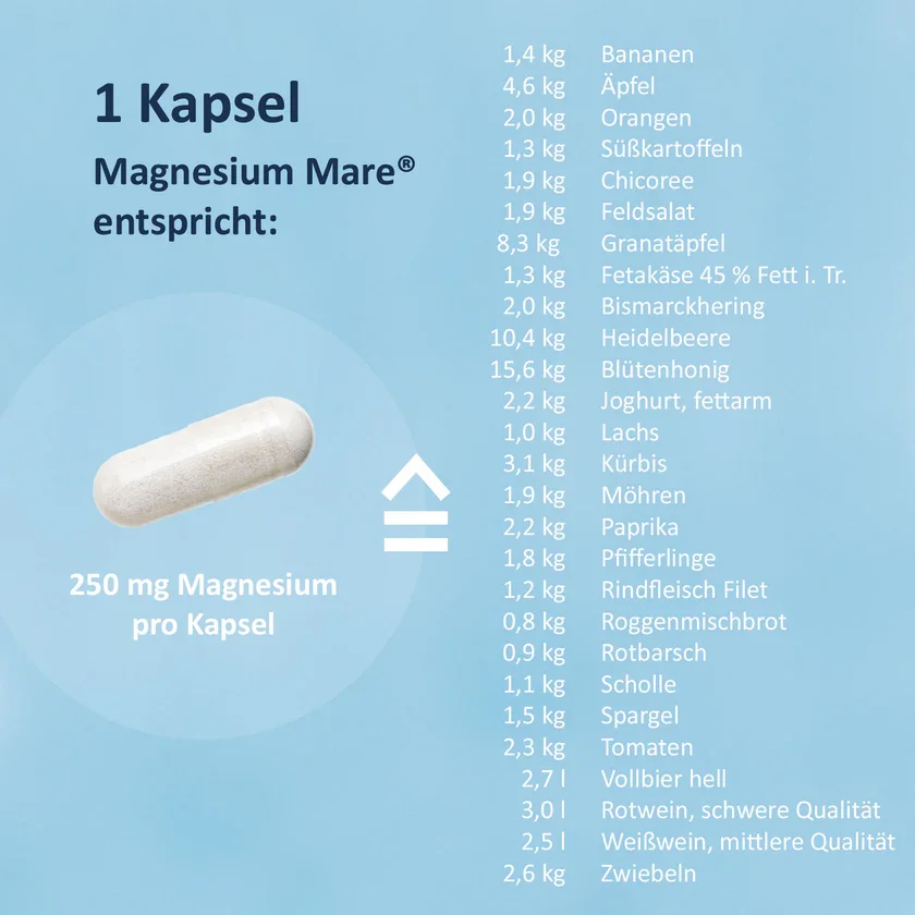 Magnesium Mare® enthält natürliches Magnesium, das direkt aus Meerwasser gewonnen wird. Dieses Magnesium ist frei von synthetischen Zusatzstoffen, Schwermetallen und Verunreinigungen. Jede Charge wird sorgfältig geprüft, um höchste Qualität und Reinheit zu gewährleisten. Dank des thermischen Extraktionsverfahrens wird das Magnesium in seiner reinsten und bioverfügbarsten Form gewonnen, was eine optimale Aufnahme und schnelle Wirkung im Körper ermöglicht.